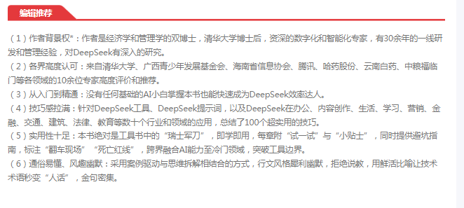 本书是一本能指引你充分挖掘DeepSeek潜能、正确掌握DeepSeek使用方法、快速获得DeepSeek使用技巧的著作,它能真正做到让不懂AI的小白也可成为AI达人,实现一步领先、步步领先。从DeepSeek工具使用、提示词编写到场景应用、本地部署和智能体设计,全面覆盖各种人群使用DeepSeek的高频需求。