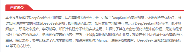 本书是系统解读DeepSeek的实用指南,从AI基础知识开始,书中讲解了DeepSeek的底层创新,详细剖析其优缺点,探讨如何通过有效提问激发DeepSeek潜能,如何规避AI幻觉,如何实现本地部署;展示了DeepSeek在创意写作、图片视频创作、职场效率提升、学习辅导、知识库构建等领域的实战应用,并探讨了其在政企智能化转型中的价值。无论你是想提升工作效率的职场人、追求创作突破的内容生产者,还是渴望把握AI机遇的企业家,都能在书中找到属于你的智能进化路径。除此之外,书中还探讨了AI未来的发展,如通用智能体 Manus、原生多模态图片、DeepSeek 后续的演化路径及 AI 学习的方法等。
