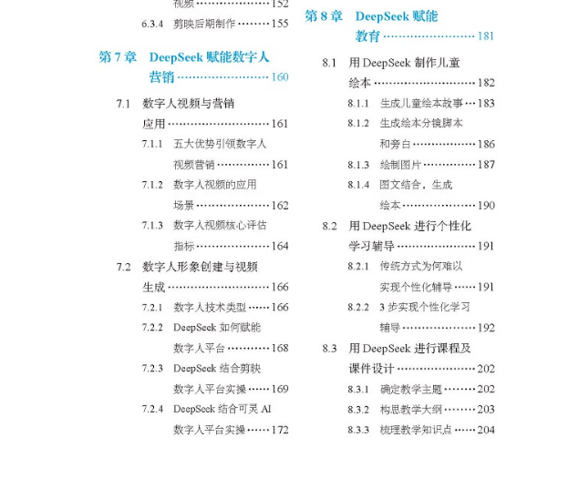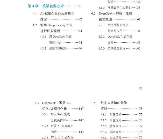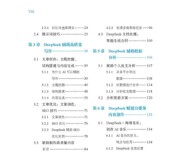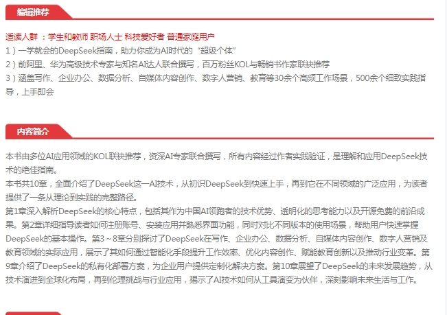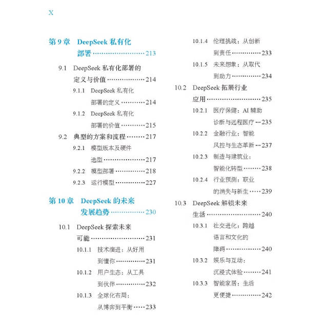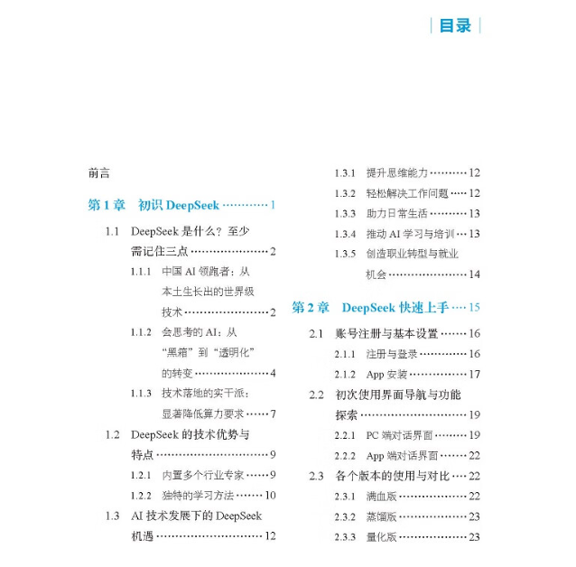 第1章深入解析DeepSeek的核心特点,包括其作为中国AI领跑者的技术优势、透明化的思考能力以及开源免费的前沿成果。第2章详细指导读者如何注册账号、安装应用并熟悉界面功能,同时对比不同版本的使用场景,帮助用户快速掌握DeepSeek的基本操作。第3~8章分别探讨了DeepSeek在写作、企业办公、数据分析、自媒体内容创作、数字人营销及教育领域的实际应用,展示了其如何通过智能化手段提升工作效率、优化内容创作、赋能教育创新以及推动行业变革。第9章介绍了DeepSeek的私有化部署方案,为企业用户提供定制化解决方案。第10章展望了DeepSeek的未来发展趋势,从技术演进到全球化布局,再到伦理挑战与行业应用,揭示了AI技术如何从工具演变为伙伴,深刻影响未来生活与工作。