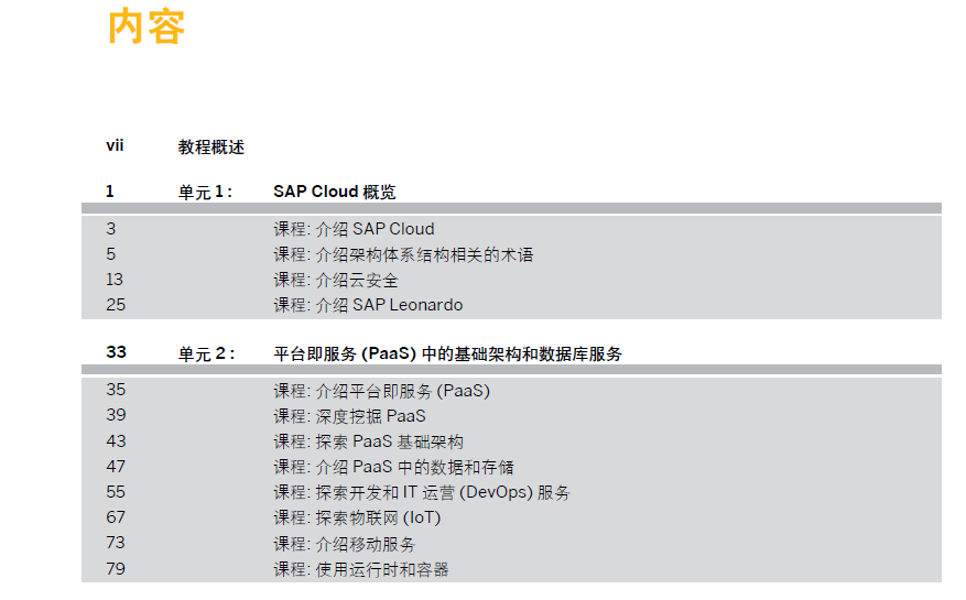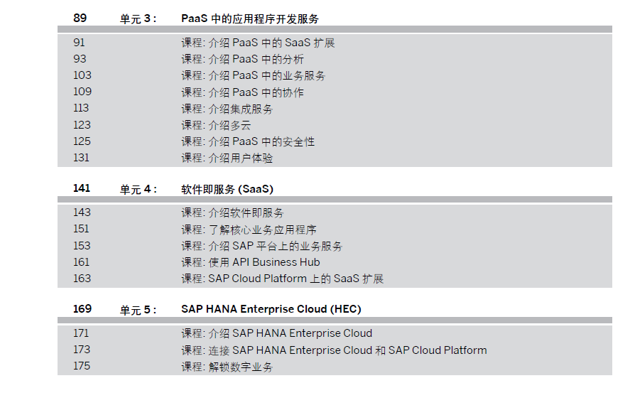 中文版-SAP BTP PA教材-CLD100_ZH_Col18 即SAP Cloud 共202页 2022年编著 PDF版目录截图如下: