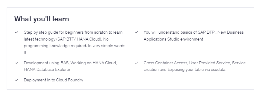 完成本课程后,我确信你将能够高效地使用 SAP BTP 和 HANA Cloud,并且无需任何帮助就能独立创建端到端的云应用项目。在学习了无数的博客、文档、文章并观看了大量视频后,我制作了本课程。我将正确的操作方法分步骤总结在了本课程中。