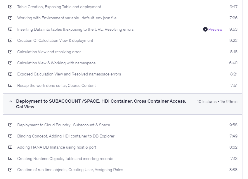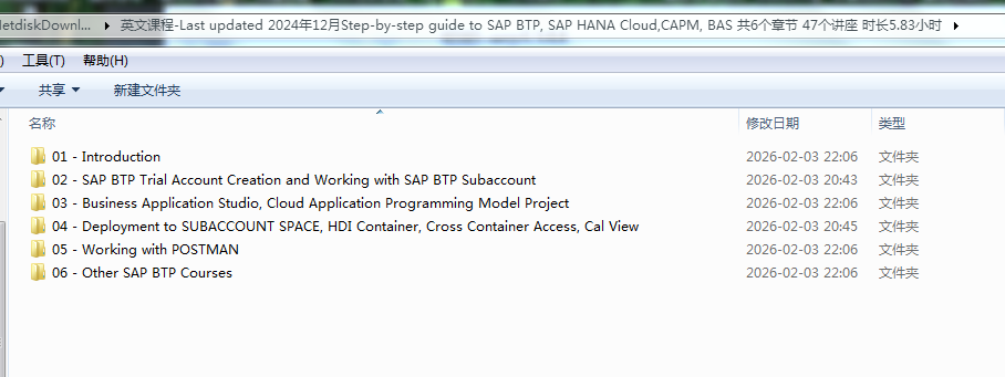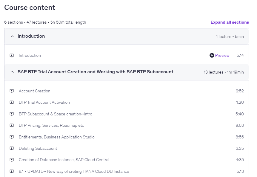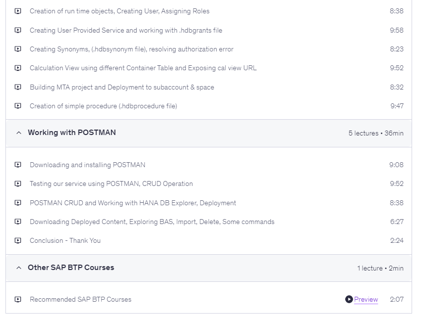 英文课程-Last updated 2024年12月Step-by-step guide to SAP BTP, SAP HANA Cloud,CAPM, BAS 共6个章节 • 47个讲座 时长5.83小时 带英文字幕目录内容截图: