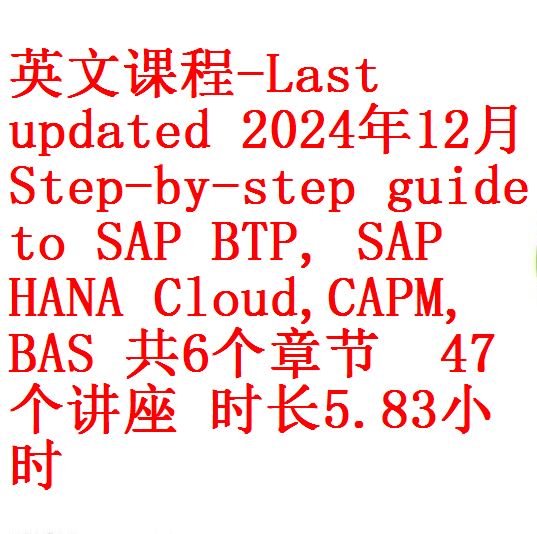 英文课程-Last updated 2024年12月Step-by-step guide to SAP BTP, SAP HANA Cloud,CAPM, BAS 共6个章节 • 47个讲座 时长5.83小时 带英文字幕试听样品.