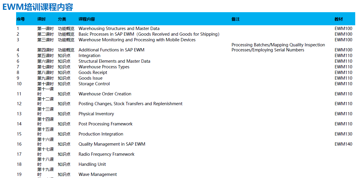 普通话授课-2020年SAP EWM培训视频教程 共18节课 时长31小时 老师课程大纲: