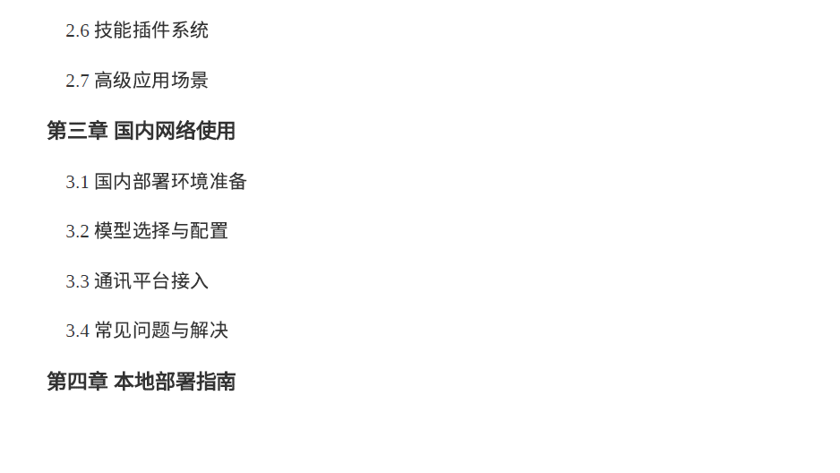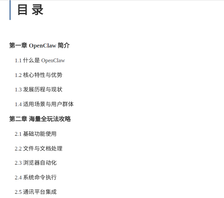 中文版-养龙虾OpenClaw完全使用手册 共45页 2026年2月编辑 PDF版目录截图如下:
