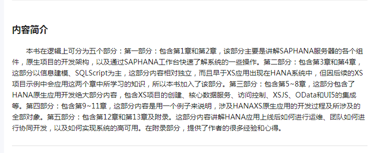 本书在逻辑上可分为五个部分:第一部分:包含第1章和第2章,该部分主要是讲解SAPHANA服务器的各个组件,原生项目的开发架构,以及通过SAPHANA工作台快速了解系统的一些操作。第二部分:包含第3章和第4章,这部分以信息建模、SQLScript为主,这部分内容相对独立,而且早于XS应用出现在HANA系统中,但因后续的XS项目示例中会应用这两个章中所学习的知识,所以本书加入了该部分。第三部分:包含第5~8章,这部分包含了HANA原生应用开发绝大部分内容,包含XS项目的创建、核心数据服务、访问控制、XSJS、OData和UI5的集成等。第四部分:包含第9~11章,这部分内容是用一个例子来说明,涉及HANAXS原生应用的开发过程及所涉及的全部对象。第五部分:包含第12章和第13章及附录。这部分内容讲解HANA应用上线后如何进行运维、团队如何进行协同开发,以及如何实现系统的高可用。在附录部分,提供了作者的很多经验和心得。