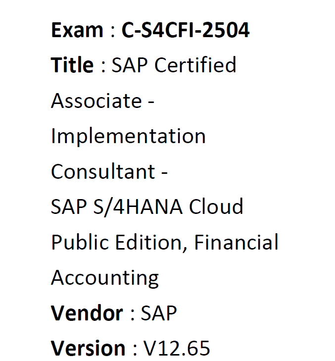 答案订正版-英文版-最新更新版公有云版SAP S4CFI 2504题库带答案 共80题 考试编码:C_S4CFI_2504 V12.65 即SAP S/4HANA Cloud Public Edition, Financial Accounting节选题库试看截图如下:
