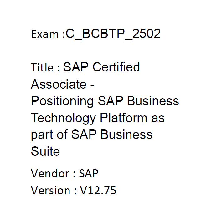 英文版-最新SAP BTP业务解决方案题库带答案 共35题 考试编码:C_BCBTP_2502 V12.75 即Positioning SAP Business Technology Platform as part of SAP Business Suite节选题库试看截图如下: