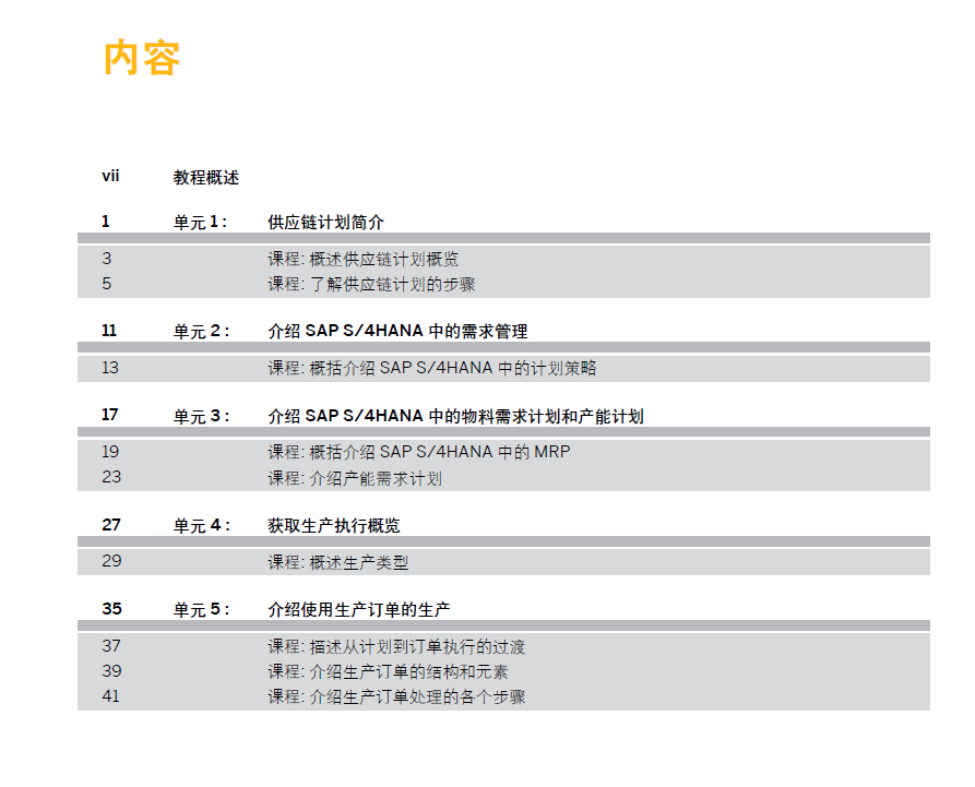 中文版-SAP公有云PP PA教材-S42000了解 SAP S4HANA Manufacturing的基础知识.ZH-CN 共53页 2025年编著 PDF目录截图如下: