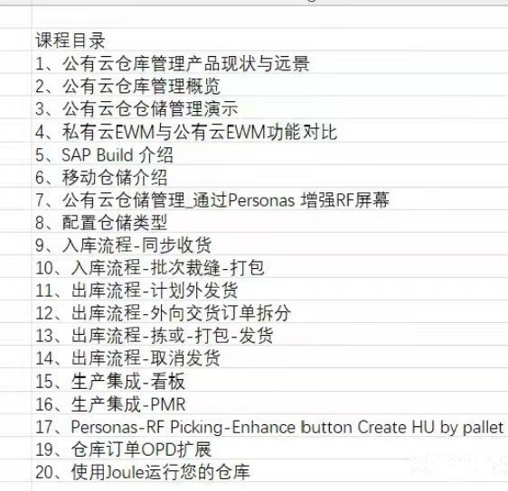 SAP官方原厂培训-中文授课-2025年公有云SAP S/4HANA Cloud EWM培训视频教程 20节课 带课件 时长9.13小时目录内容截图: